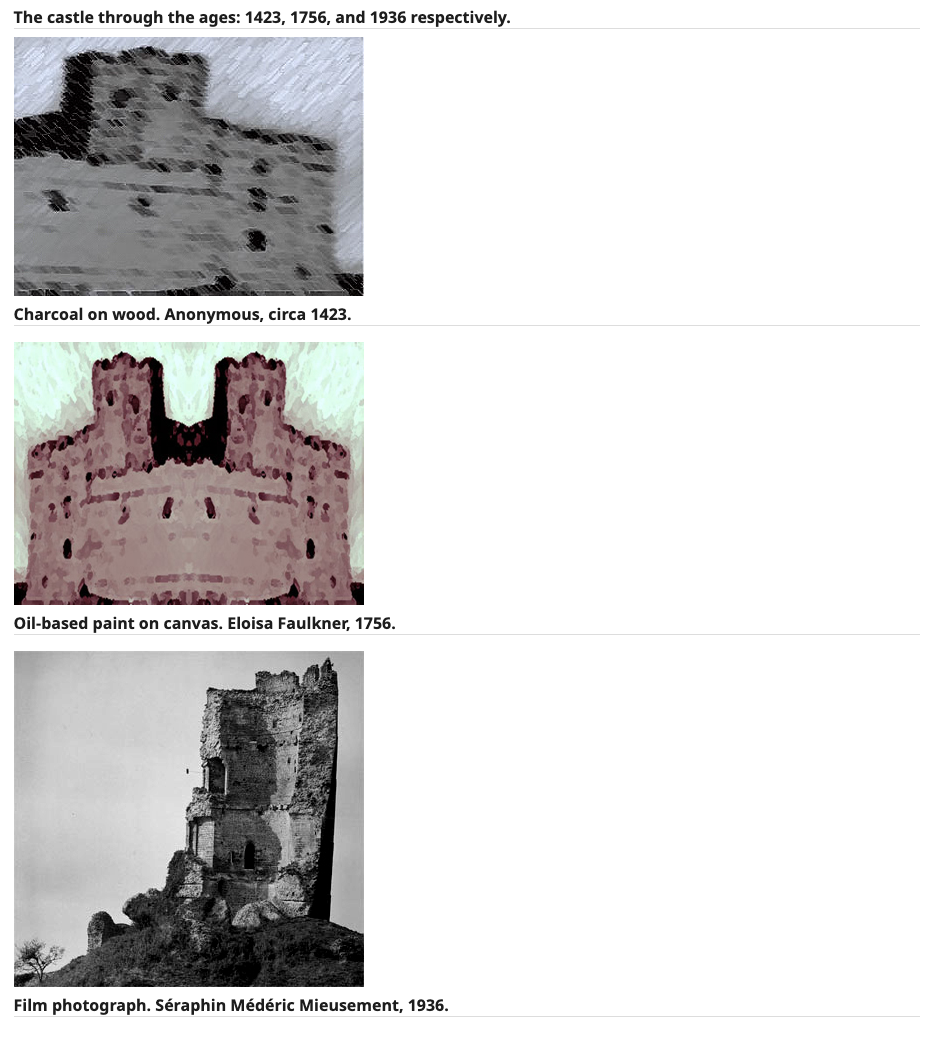 다른 경우에는 이미지 그룹이 관련 이미지의 컬렉션을 나타낼 수 있습니다. 예를 들어, 주제별로 관련된 예술 작품 모음을 표시할 수 있습니다. 이 경우 각 이미지에는 그룹 내 관계뿐만 아니라 개별 이미지를 설명하는 대체 텍스트가 필요합니다.