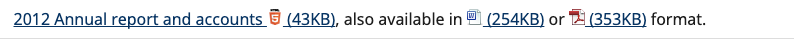 이 예에서는 텍스트 링크 내의 형식 아이콘으로 식별되는 세 가지 형식으로 문서를 다운로드할 수 있습니다. 각 링크의 파일 형식을 구분하기 위해 'HTML', 'Word 문서', 'PDF'라는 텍스트 대체 아이콘이 있습니다.
