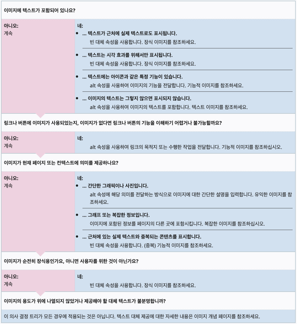 이 의사 결정 트리에서는 다양한 상황에서 <img> 요소의 alt 속성을 사용하는 방법을 설명합니다. 일부 유형의 이미지의 경우 텍스트 이미지 대신 장식용 이미지나 웹 글꼴에 CSS 배경 이미지를 사용하는 등의 대체 접근 방식이 있습니다.