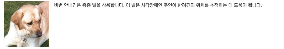 다음 이미지는 방울을 착용한 개를 보여줍니다. 이 이미지는 이 종의 용도를 설명하는 인접한 텍스트를 보완합니다. 시각적으로 표시되지만 텍스트에 설명되지 않은 정보는 짧은 텍스트로 대체하여 설명할 수 있으며, 이 경우 대체 텍스트는 "목줄에 방울이 달린 개"입니다.