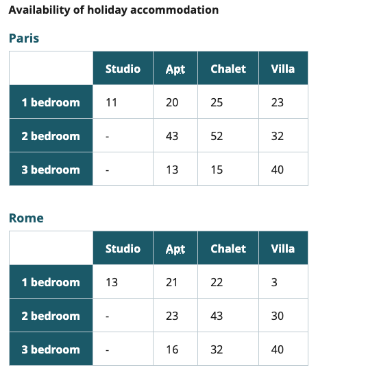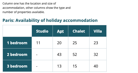 <span id="paris-summary">Column one has the location and size of accommodation, other columns show the type and number of properties available.</span>