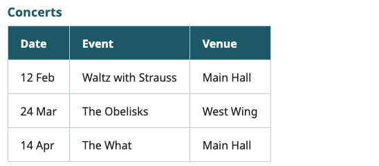캡션은 테이블 콘텐츠에 대한 짧은 제목이어야 합니다. 이 예에서 "콘서트"는 사용자에게 테이블에 어떤 정보가 있는지 알려줍니다(예: 테이블에 미술 전시회 정보도 포함될 수 있음).
