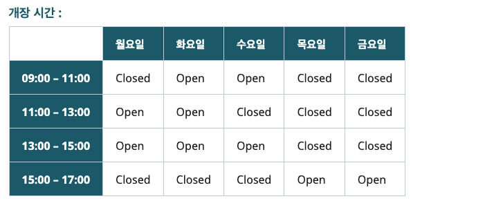 헤더 행에서 scope의 col 값은 각 헤더 셀을 열의 데이터 셀과 연결합니다. 헤더 열에서 행 값은 개별 헤더를 해당 행과 연결합니다. 이 정보가 없으면 일부 사용자는 헤더와 데이터 셀 간의 관계를 쉽게 이해하지 못할 수 있습니다. 아래 예에서 'Open' 및 'Closed' 레이블은 특정 요일과 시간에 할당할 수 있는 경우에만 유용합니다.