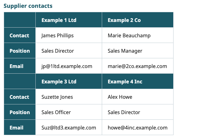 예를 들어 아래 예시에서와 같이 테이블의 구조가 비정상적인 경우 어떤 행 또는 열에서 어떤 콘텐츠를 찾을 수 있는지에 대한 정보를 사용자에게 제공할 수 있습니다. 요약은 일반적으로 복잡한 테이블에만 필요합니다.