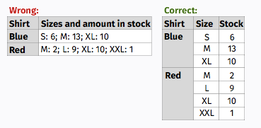 많은 경우, 예 3)에 표시된 것처럼 정보를 더 작고 관리하기 쉬운 테이블로 분할하여 모든 독자가 덜 복잡하게 만들 수 있도록 이러한 테이블의 정보를 재구성하는 것을 고려할 가치가 있습니다.