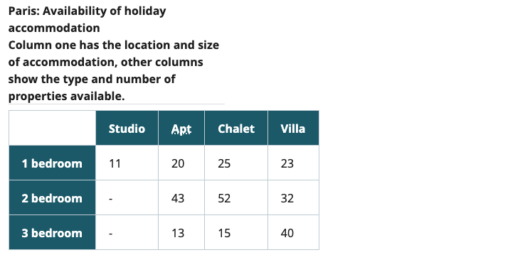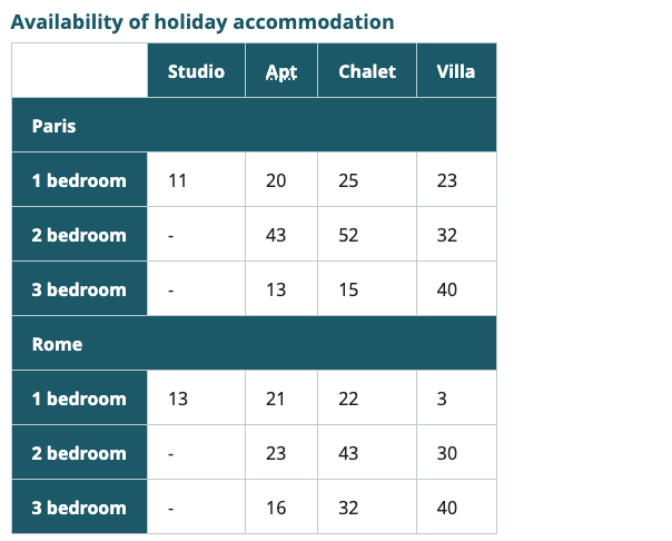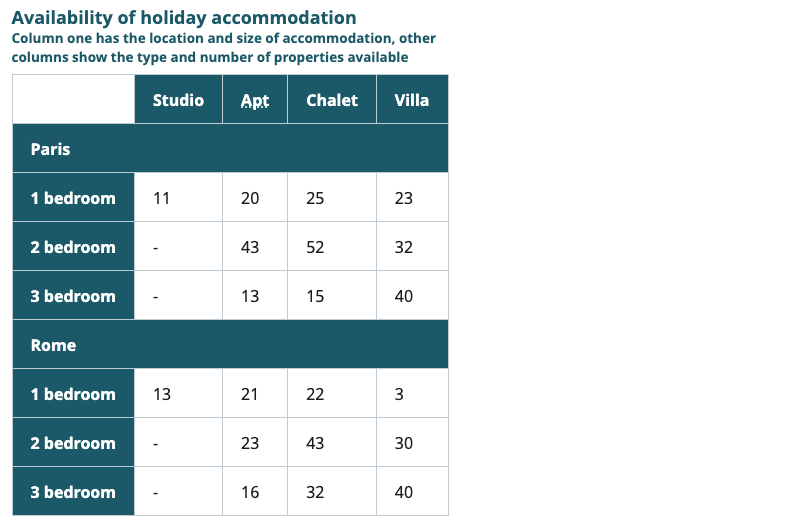 <span>Column one has the location and size of accommodation, other columns show the type and number of properties available.</span>
