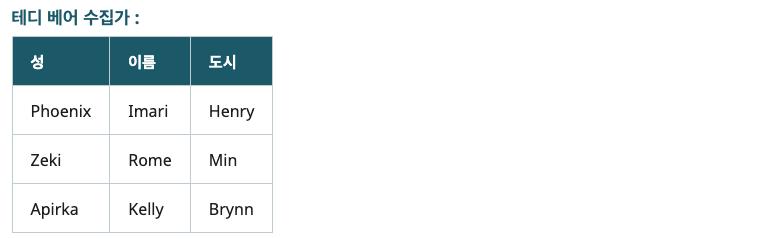 이 예제에서는 데이터(이름, 성, 도시)가 각각 어떤 헤더에 해당하는지 알지 못하면 서로 구분할 수 없습니다. 값이 col인 scope 속성은 헤더 셀의 방향을 정의하고 해당 데이터 셀과 연결합니다. scope 속성은 헤더 행 또는 열이 하나인 큰 테이블에도 필요합니다.