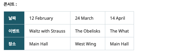 다음 콘서트 표에는 첫 번째 행의 셀이 <th> 요소를 사용하여 마크업되어 있습니다. 이 표는 매우 작은 표이고 데이터 자체가 각 열에서 뚜렷하게 다르기 때문에 헤더와 데이터 셀 간의 관계가 분명하기 때문에 허용됩니다.